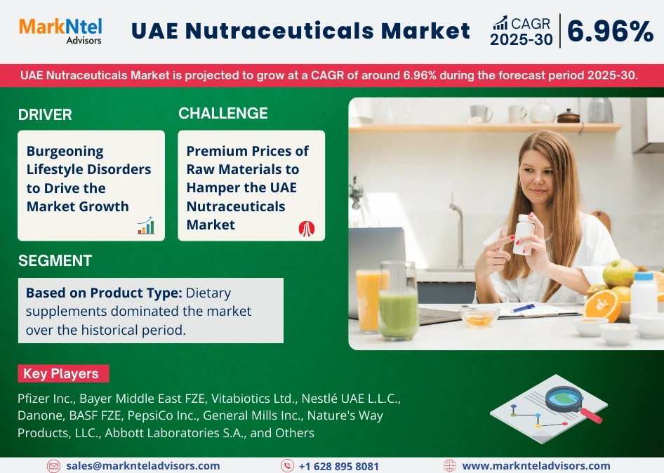 As per MarkNtel Advisors the UAE Nutraceuticals Market is projected to grow at a CAGR of around 6.96% during the forecast period, i.e., 2025-30.
