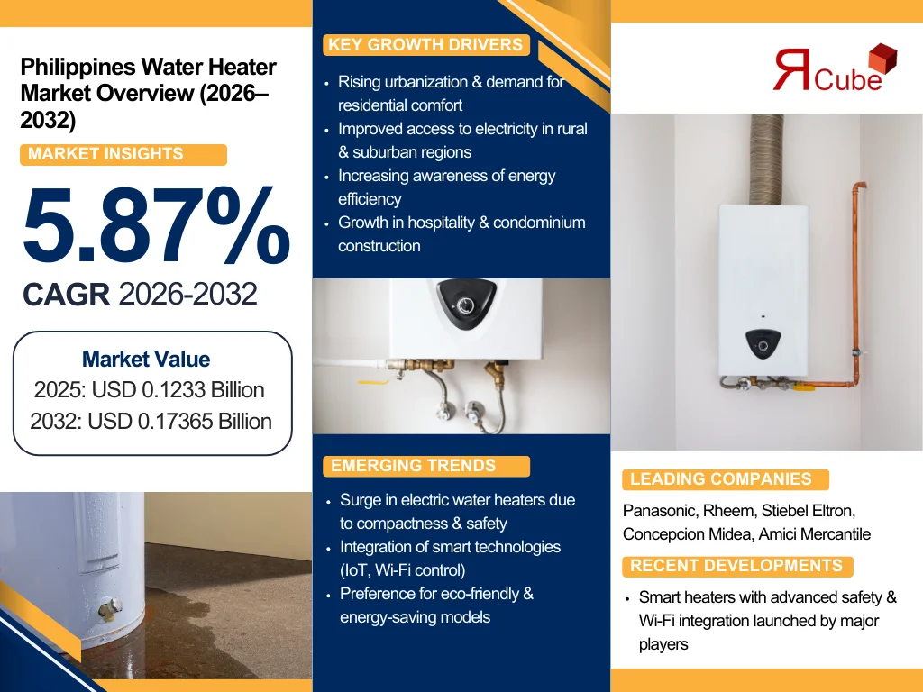 The Philippines Water Heater Market reached a value of nearly USD 0.1233 Billion in 2025. The market is assessed to grow at a CAGR of around 5.87%, during the forecast period of 2026-2032 to attain a value of around USD 0.17365 Billion in 2032. The industry is compelled by growing demand for residential comfort, increasing urbanization, and enhanced access to electricity in rural & suburban areas.