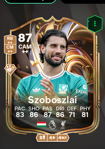 Dominik Szoboszlai's Ratings Reload card features him as a Central Attacking Midfielder with an impressive overall rating of 87, boasting standout attributes such as 83 pace, 86 shooting, 87 passing, 86 dribbling, 71 defense, and 81 physicality. This combination of high ratings makes Szoboszlai a dynamic and versatile presence in the midfield, capable of orchestrating attacks, threading pinpoint passes, and making decisive runs into the box. As a CAM, his sharp offensive skills and well-rounded stats allow him to break down opposing defenses with ease, create scoring opportunities for teammates, and provide the creative spark needed to turn the tide of any match.