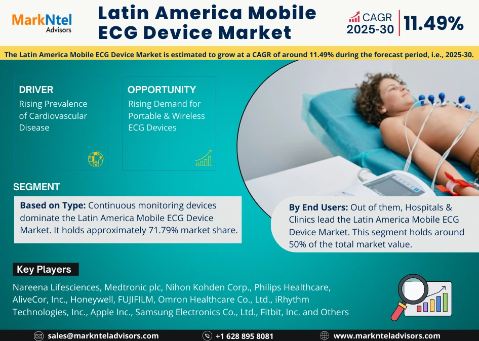 MarkNtel Advisors, a leading market research and consulting firm, has announced the release of its latest study titled Latin America Mobile ECG Device Market Research Report: Forecast (2025–2030). This report provides a detailed assessment of the Latin America Mobile ECG Device Market, covering its evolving dynamics, emerging trends, key growth drivers, major challenges, and competitive landscape.