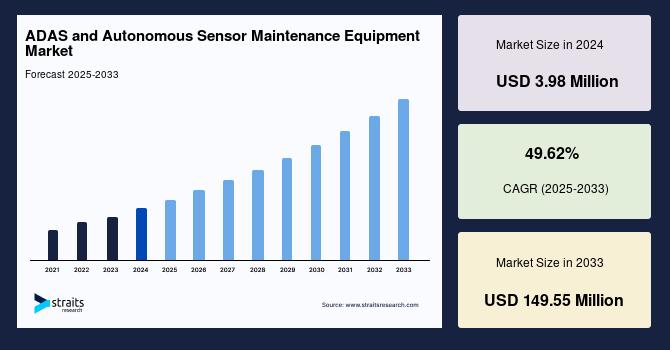 According to StraitsResearch, the global adas and autonomous sensor maintenance equipment market size is valued at USD 3.98 million in 2024 and is estimated to reach USD 149.55 million by 2033, growing at a CAGR of 49.62% during 2025-2033.