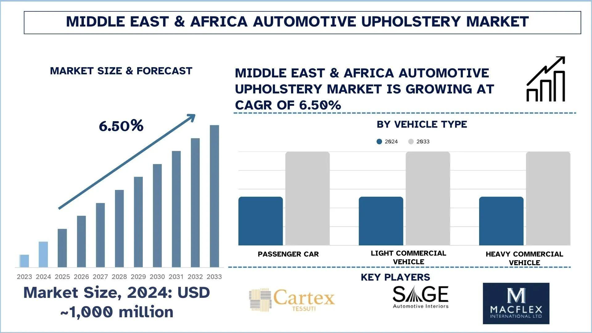 According to UnivDatos, Growing Sales of SUVs and Premium Vehicles, and Regional OEM/assembly expansion and localization push are some of the factors that have promoted market rise. As per their “Middle East & Africa Automotive Upholstery Market” report, the Middle East & Africa market was valued at USD 1,000 million in 2024, growing at a CAGR of about 6.50% during the forecast period from 2025 - 2033 to reach USD million by 2033. The automotive upholstery of the Middle East and Africa market is experiencing swift change due to changes in consumer preferences, technologies, and increased automotive manufacturing capacities. Climate and increasing demand for luxurious cars have increased the transition to materials that are durable, easy to clean, and that do not build up heat very fast in the region. The use of synthetic leather, performance fabrics, and sustainable materials is becoming a defining factor as both OEMs and aftermarket investors strive to provide comfort, performance, and aesthetics that align with the needs of the regions. As more and more funds are currently being invested in automotive production and the growing demand by the passenger and commercial division, the upholstery market is set to see vigorous growth and new ideas regarding the types of material used and the way to use them.