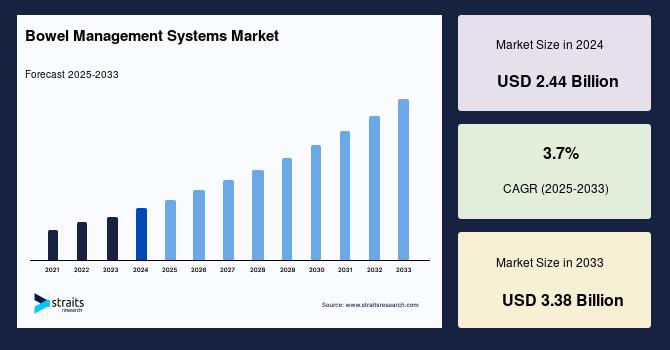 According to StraitsResearch, the global bowel management systems market size is valued at USD 2.44 billion in 2024 and is estimated to reach USD 3.38 billion by 2033, growing at a CAGR of 3.7% during 2025-2033.