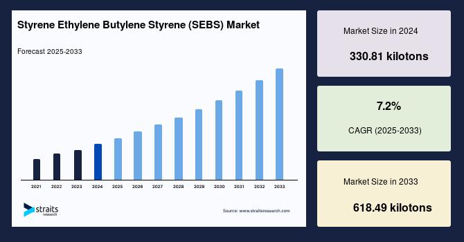 According to StraitsResearch, the global styrene ethylene butylene styrene market size was valued at 330.81 kilotons in 2024 and is estimated to reach 618.49 kilotons by 2033, growing at a CAGR of 7.2% during 2025-2033.