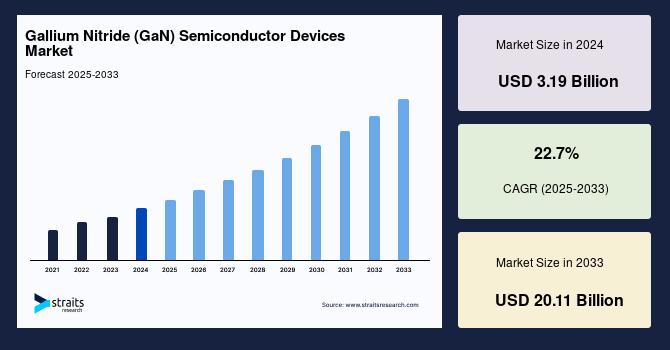 According to StraitsResearch, the global gallium nitride semiconductor devices market size was valued at USD 3.19 billion in 2024 and is estimated to reach USD 20.11 billion by 2033, growing at a CAGR of 22.7% during 2025-2033.