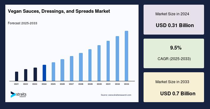 According to StraitsResearch, the global vegan sauces dressings and spreads market size was valued at USD 0.31 billion in 2024 and is estimated to reach USD 0.7 billion by 2033, growing at a CAGR of 9.5% during 2025-2033.