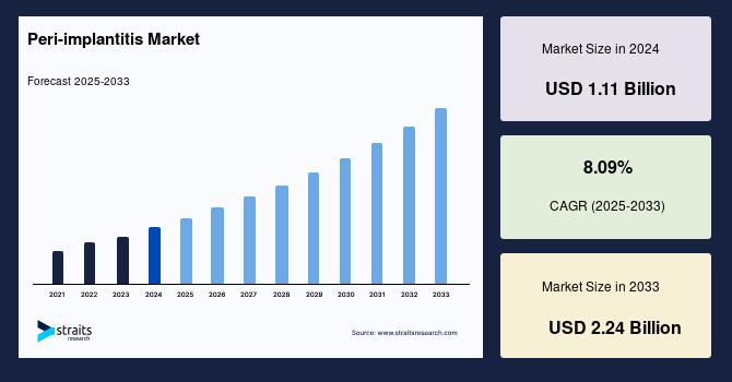 According to StraitsResearch, the global peri implantitis market size was valued at USD 1.11 billion in 2024 and is estimated to reach USD 2.24 billion by 2033, growing at a CAGR of 8.09% during 2025-2033.