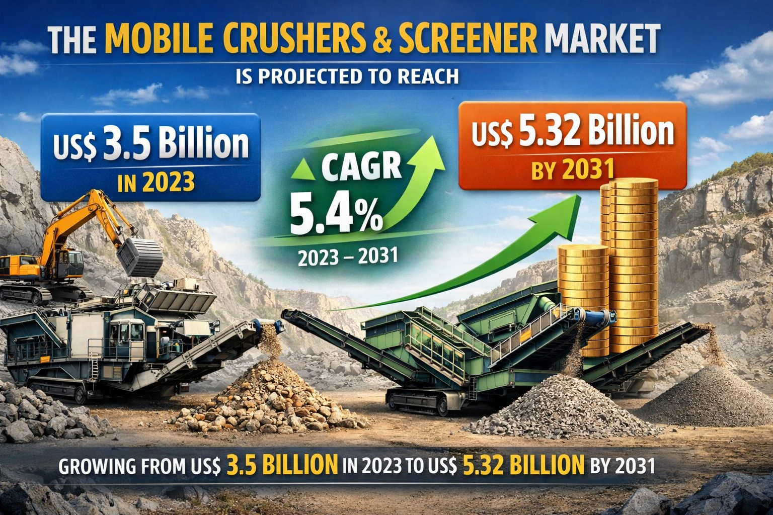 The mobile crushers and screener market is projected to reach US$ 5.32 billion by 2031 from US$ 3.5 billion in 2023. The market is expected to register a CAGR of 5.4% in 2023–2031. This consistent growth trajectory is driven by a confluence of factors, including rapid urbanization in developing nations, a global surge in infrastructure redevelopment, and the increasing viability of recycled construction materials.