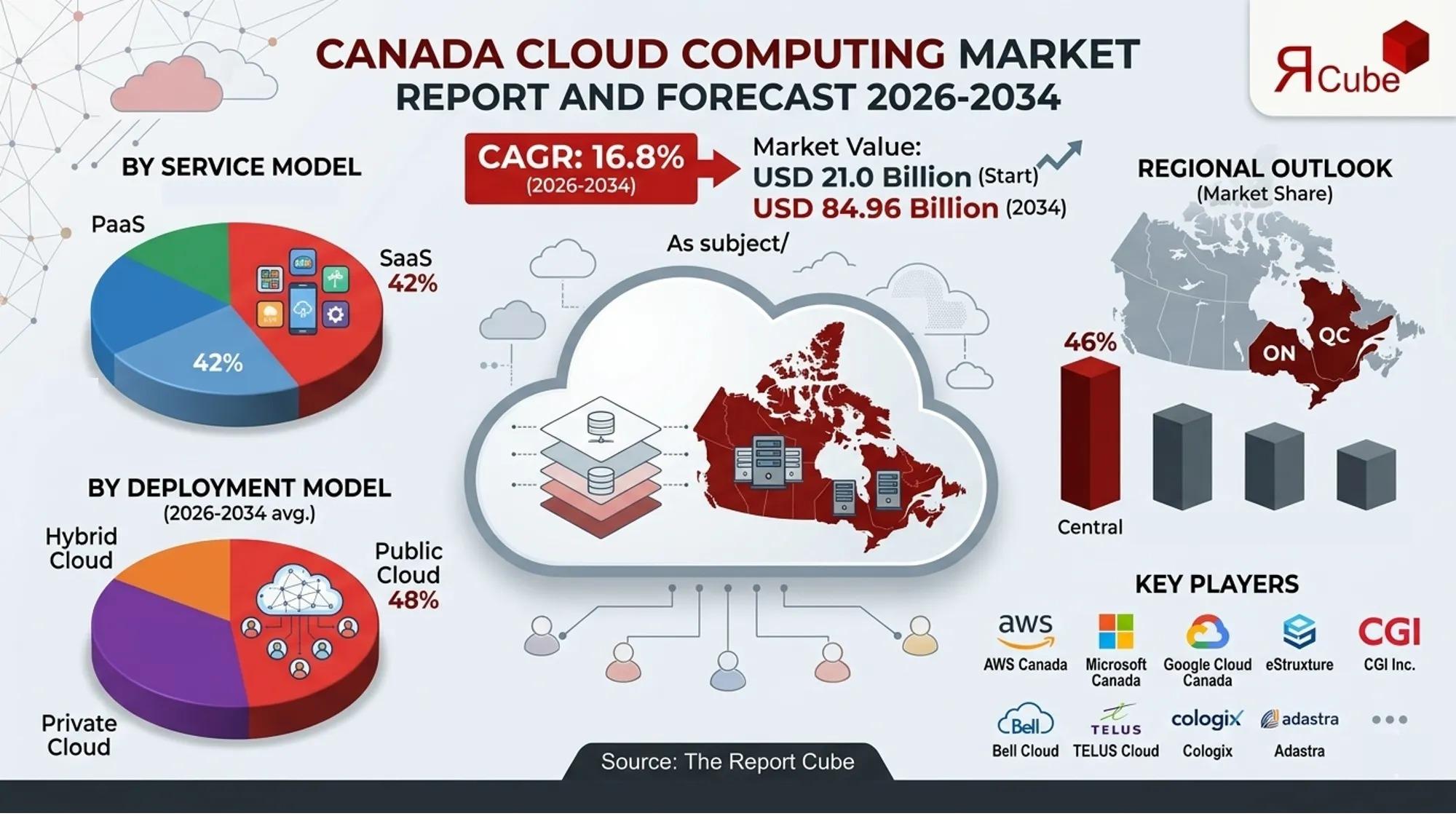 According to recent research report by The Report Cube, the size of Canada Cloud Computing Market was nearly USD 21.0 Billion in 2025, and by 2034 it is expected to reach around USD 84.96 Billion with a CAGR of 16.8% over the forecast period (2026-2034).