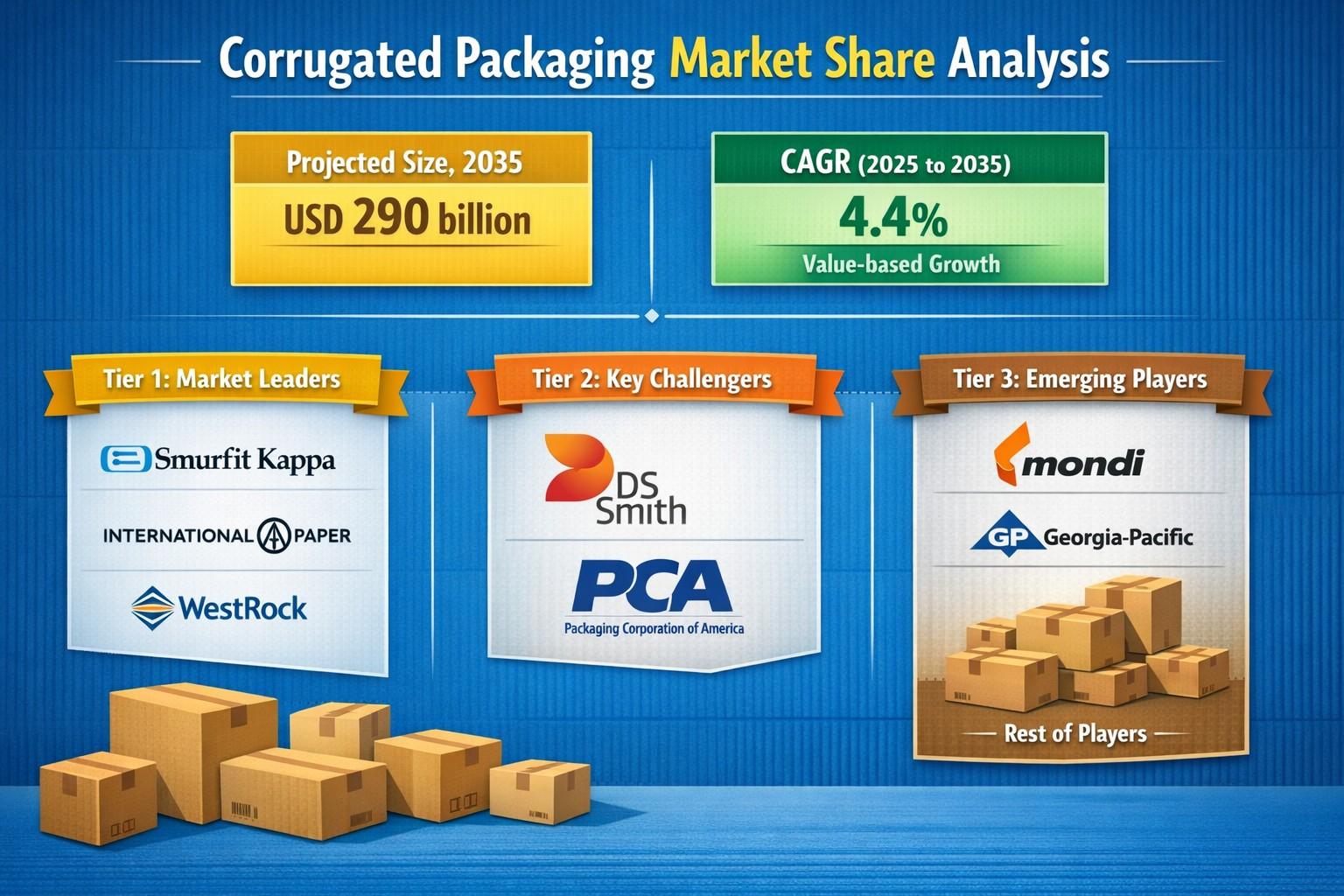 The Corrugated Packaging Market is projected to reach USD 290 billion by 2035, expanding at a CAGR of 4.4% during 2025–2035. Growth in the Corrugated Packaging Market is being driven by increasing demand for sustainable, lightweight, and protective packaging solutions across industries including e-commerce, food & beverages, and pharmaceuticals. Companies such as Smurfit Kappa, International Paper, and WestRock are shaping the competitive landscape through technological innovation, recyclable materials, and smart packaging solutions. As global logistics networks expand and sustainability initiatives intensify, the Corrugated Packaging Market continues to evolve as a critical component of modern supply chains.