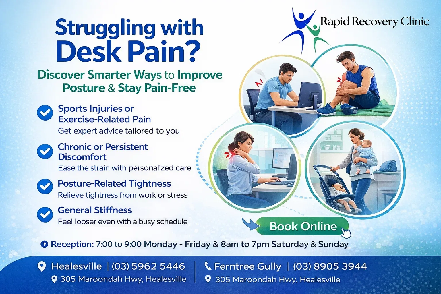 Don’t let desk work affect your health and comfort. With the right support from Healesville Osteopathy and Ferntree Gully Massage, you can improve posture, reduce pain, and feel more active every day.