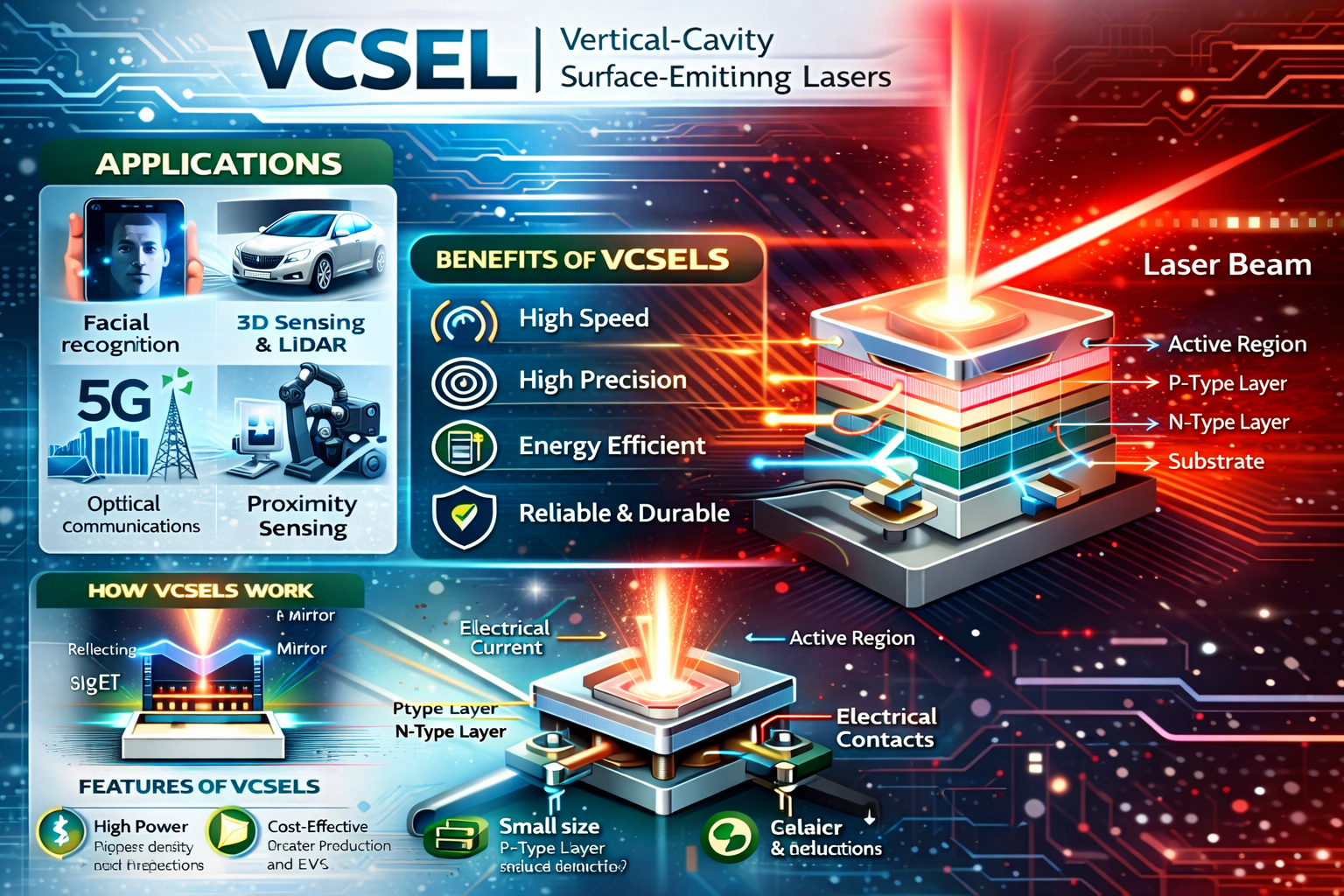 Vertical cavity surface emitting lasers (VCSELs) are primarily used in data communication, optical communications, and consumer electronics. They are critical in enabling short-range optical transmitters and 3D sensing applications, especially in smartphones and autonomous vehicles.