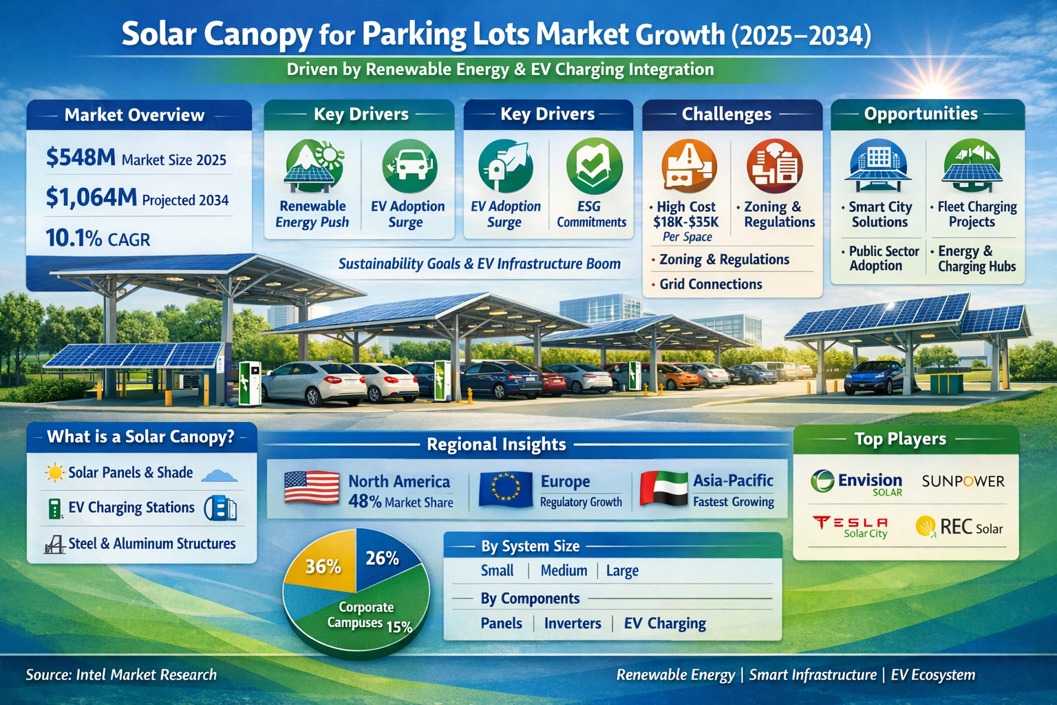 According to a new report from Intel Market Research, the global Solar Canopy for Parking Lots market was valued at USD 548 million in 2025 and is projected to reach USD 1,064 million by 2034, growing at a CAGR of 10.1% during the forecast period (2026-2034). This rapid expansion is fueled by the global push toward renewable energy solutions, the integration of EV charging infrastructure, and the commercial sector's growing adoption of sustainable parking solutions.