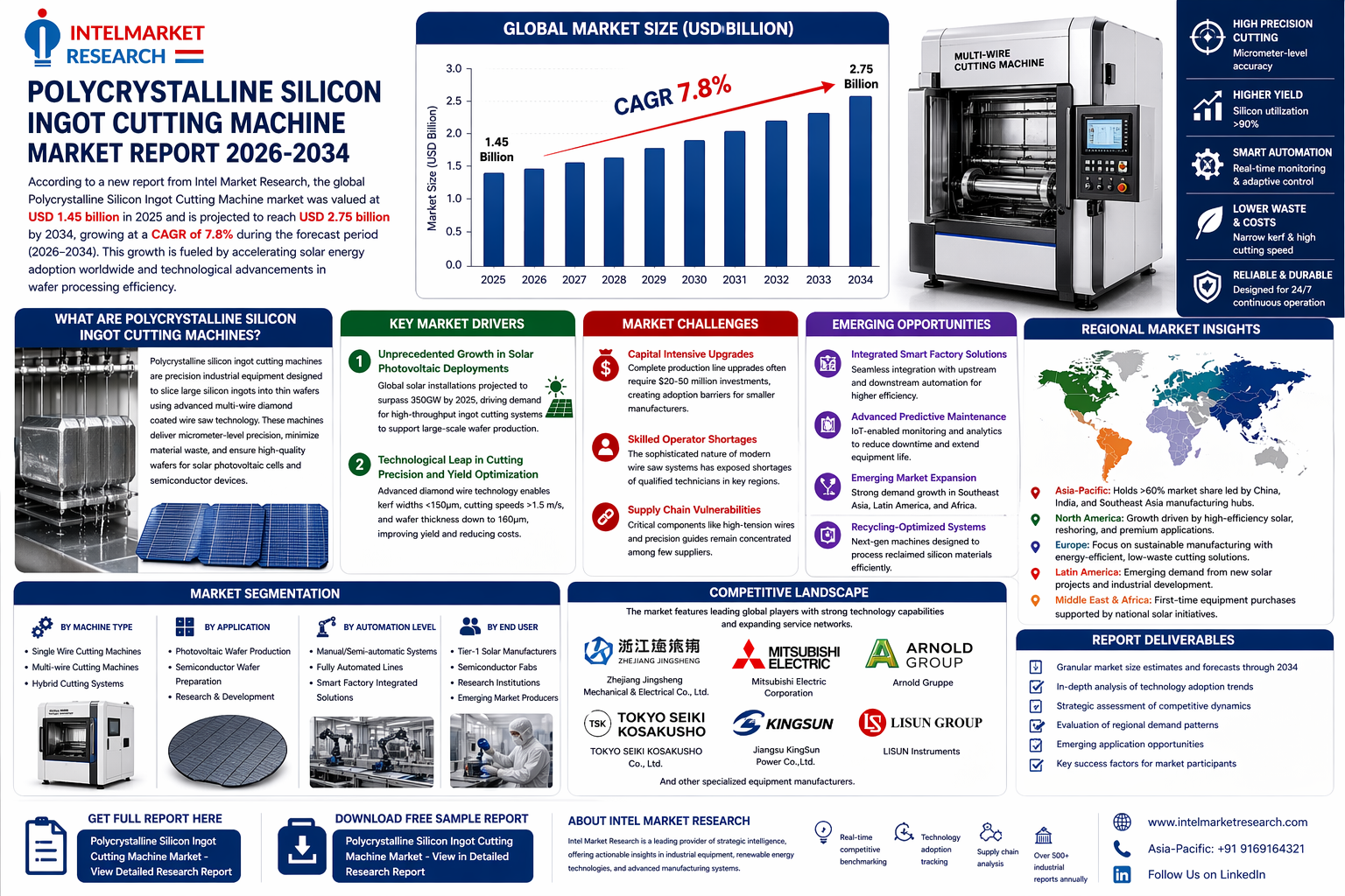 According to a new report from Intel Market Research, the global Polycrystalline Silicon Ingot Cutting Machine market was valued at USD 1.45 billion in 2025 and is projected to reach USD 2.75 billion by 2034, growing at a CAGR of 7.8% during the forecast period (2026–2034). This growth is fueled by accelerating solar energy adoption worldwide and technological advancements in wafer processing efficiency.