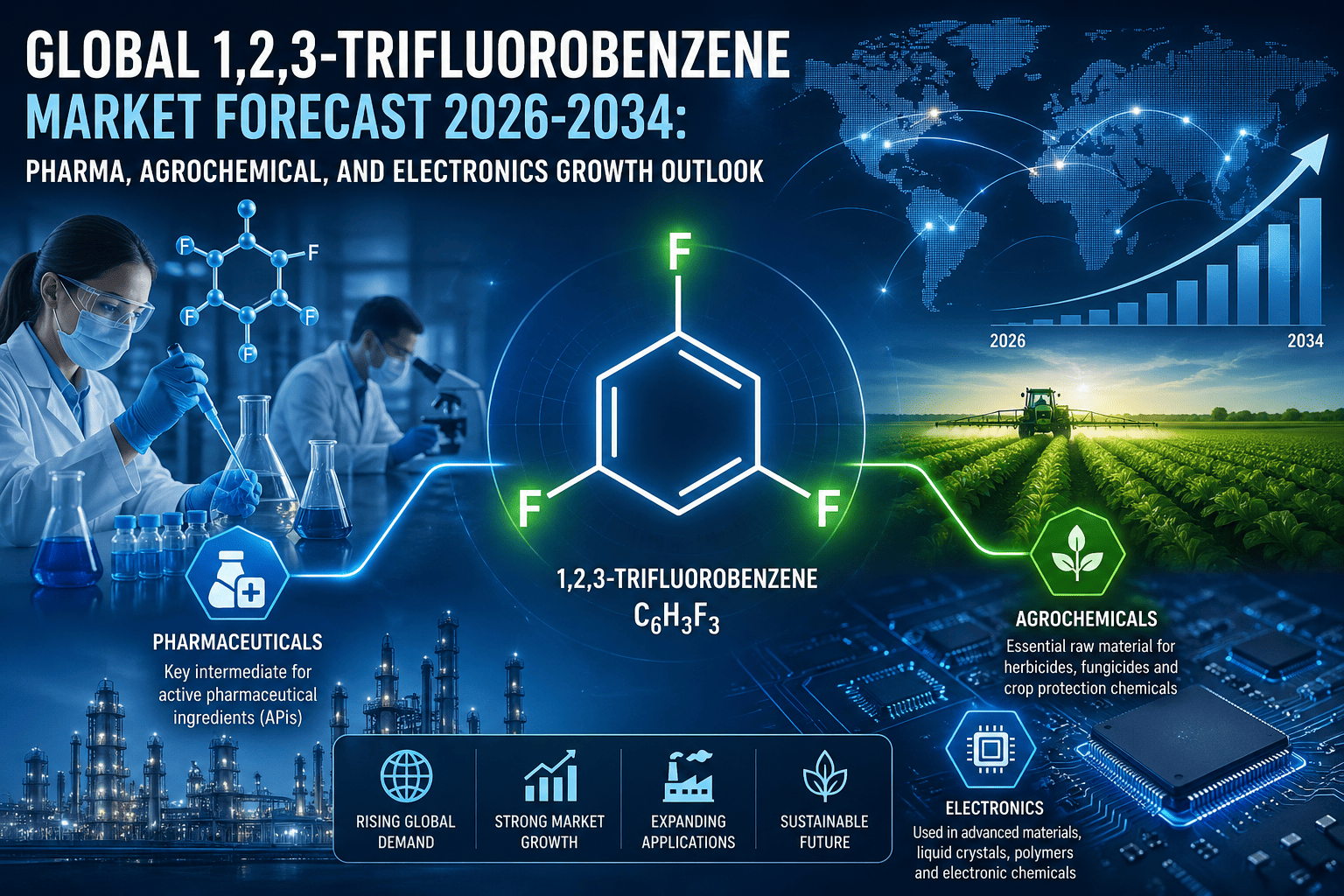 2. Expanding Applications in Liquid Crystal and Advanced Electronic Materials: Beyond the life sciences sector, 1,2,3-Trifluorobenzene serves as a key precursor in the synthesis of liquid crystal materials used in flat-panel displays and advanced optoelectronic devices. The global proliferation of consumer electronics — encompassing smartphones, high-resolution tablets, and next-generation monitors — has created sustained downstream demand for high-purity liquid crystal compounds, many of which trace their synthetic origins to fluorinated aromatic intermediates. Furthermore, the compound finds application in specialty polymers and high-performance coatings where fluorine content imparts superior thermal stability, chemical resistance, and low surface energy characteristics. As the electronics industry continues its pivot toward flexible displays, 5G infrastructure components, and wearable technologies, the requirement for precisely engineered fluorinated intermediates is expected to remain robust over the forecast period.