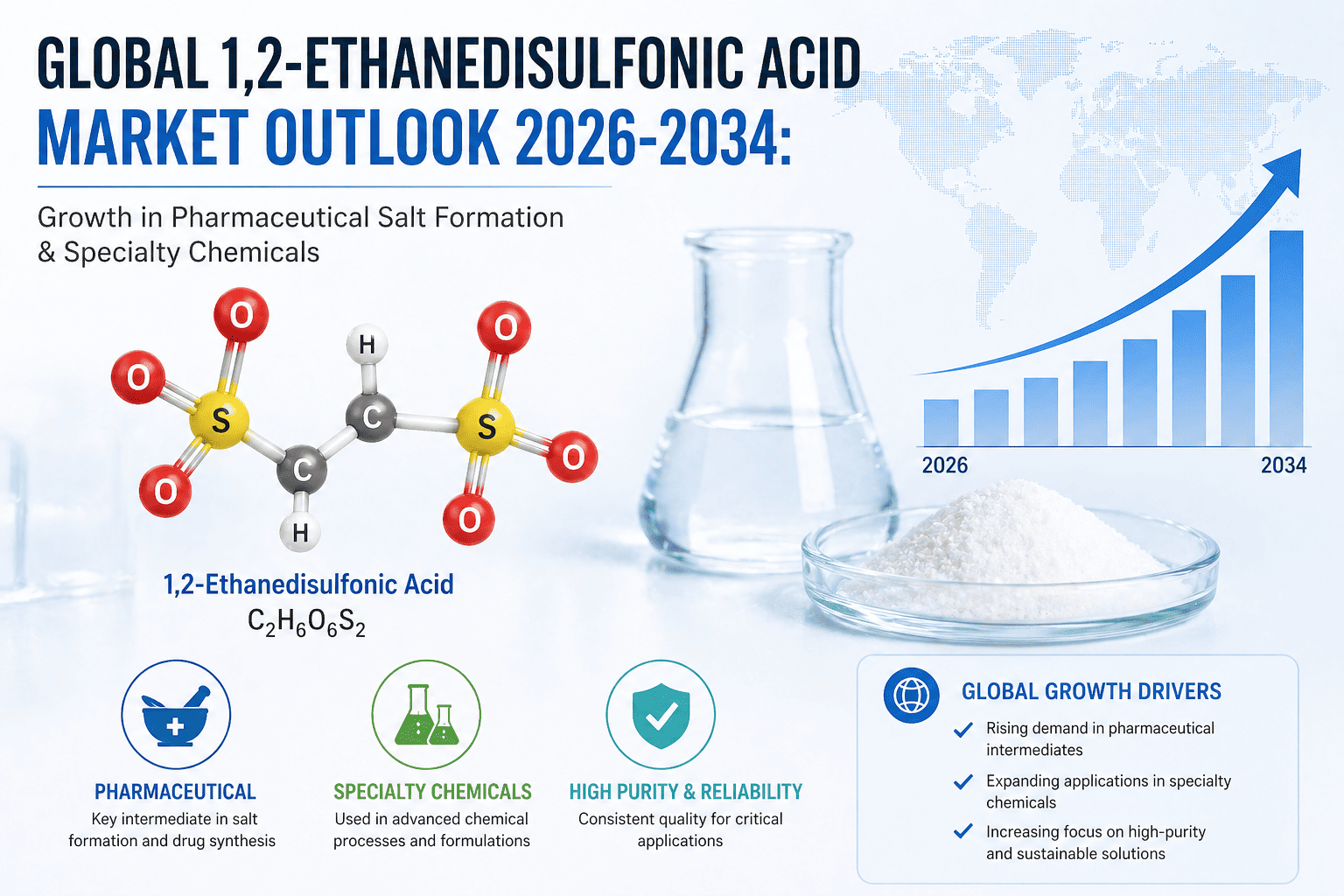 Expanding Application in Next-Generation Drug Formulation Platforms: Emerging drug delivery technologies, including amorphous solid dispersions, co-crystals, and nanosuspension formulations, are creating new evaluation opportunities for 1,2-ethanedisulfonic acid as a salt-forming agent for challenging molecules in pharmaceutical pipelines. The increasing proportion of new chemical entities classified under Biopharmaceutics Classification System Class II and Class IV — characterized by low solubility — is driving renewed interest in salt screening and selection processes. Edisylate salts have demonstrated favorable solubility-enhancing properties for specific molecular scaffolds, positioning 1,2-ethanedisulfonic acid as a strong candidate for inclusion in expanded preformulation screening panels across both innovator and generic drug developers worldwide.