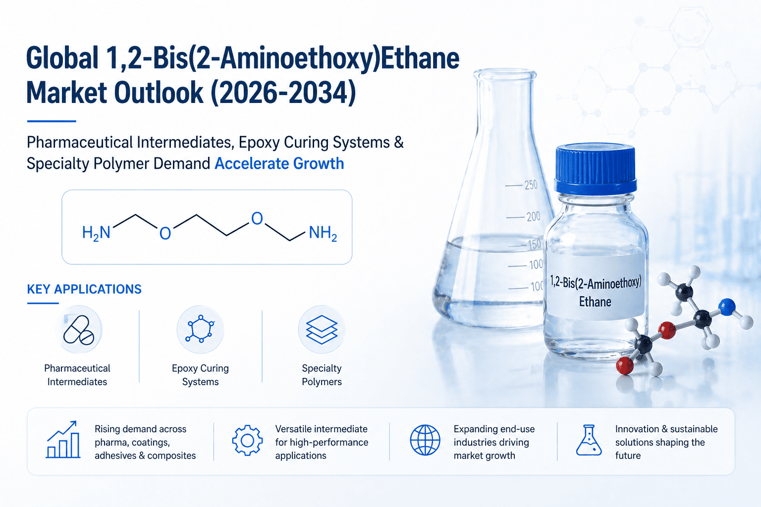 1. Rising Demand from Epoxy Resin Curing Agent Applications: The global market for 1,2-Bis(2-Aminoethoxy)Ethane is experiencing sustained momentum driven by its widespread role as a curing agent and hardener in high-performance epoxy resin systems. Epoxy resins underpin construction, aerospace, automotive, and electronics industries globally, and the choice of hardener directly governs the mechanical and chemical performance of the cured material. Because of its flexible ether backbone and reactive primary amine groups, 1,2-Bis(2-Aminoethoxy)Ethane imparts meaningfully improved flexibility and impact resistance to cured epoxy systems when compared to conventional aromatic or standard aliphatic amines. This performance advantage makes it particularly valuable in structural adhesives, industrial protective coatings, and composite laminates where mechanical stress tolerance is a non-negotiable engineering requirement. As infrastructure investment accelerates across Asia-Pacific and the Middle East, demand for performance-engineered epoxy formulations—and by extension for specialized curing agents—continues to grow at a consistent and measurable pace.
